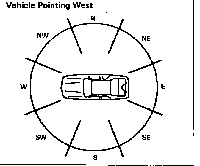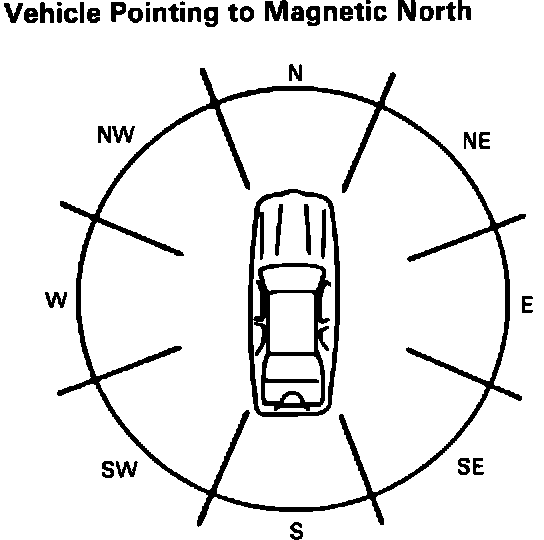 Compass thermometer calibration and vehicle demagnetizing have been performed by the manufacturer. However, the True North Adjustment has not been performed. Vehicle location will determine how accurate the compass is without performing the True North Adjustment. In coastal or mountainous areas the differences between true north and magnetic north vary considerably. Whenever a vehicle is from the manufacturer or whenever a compass is thought to be inaccurate, the first step taken should be to perform the True North Adjustment. The compass True North Adjustment is done using the following procedure:
