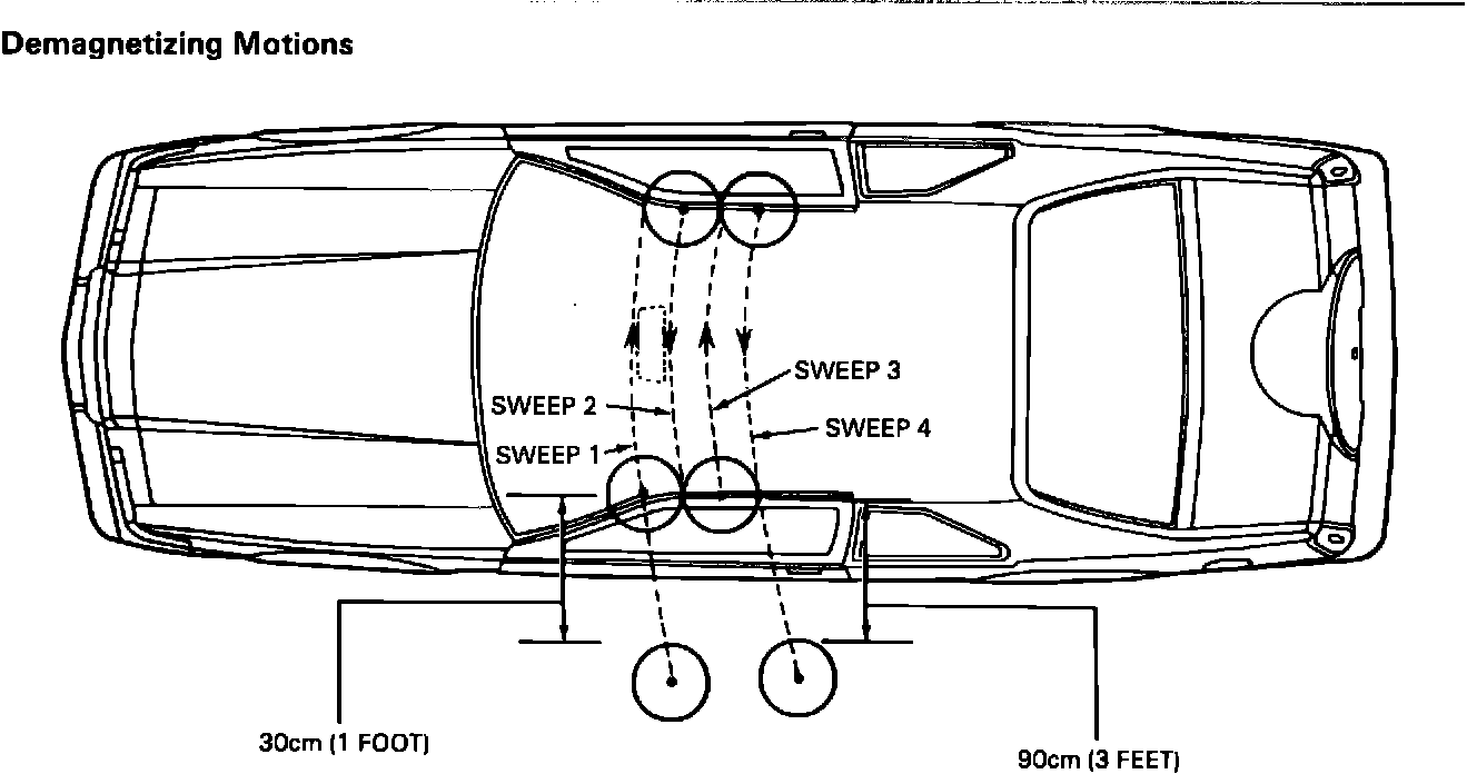 The demagnetizing process requires the use of a demagnetizing coil commonly used by television service technicians to demagnetize television tubes. Demagnetize the vehicle by sweeping across the roof area over the compass with a demagnetizing coil as follows: