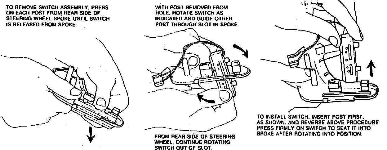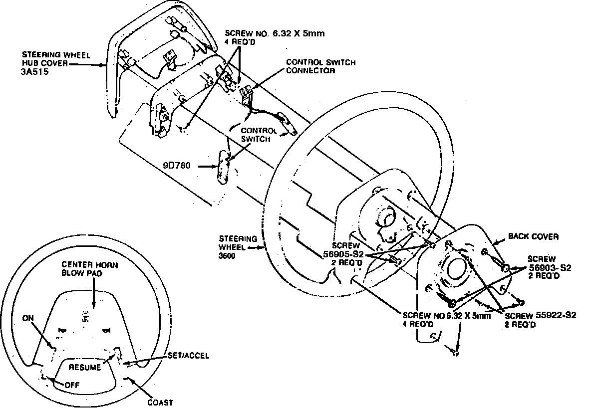 4. Remove six screws retaining back cover to the steering wheel. Separate back cover from steering wheel, then disconnect control switch electrical connector.