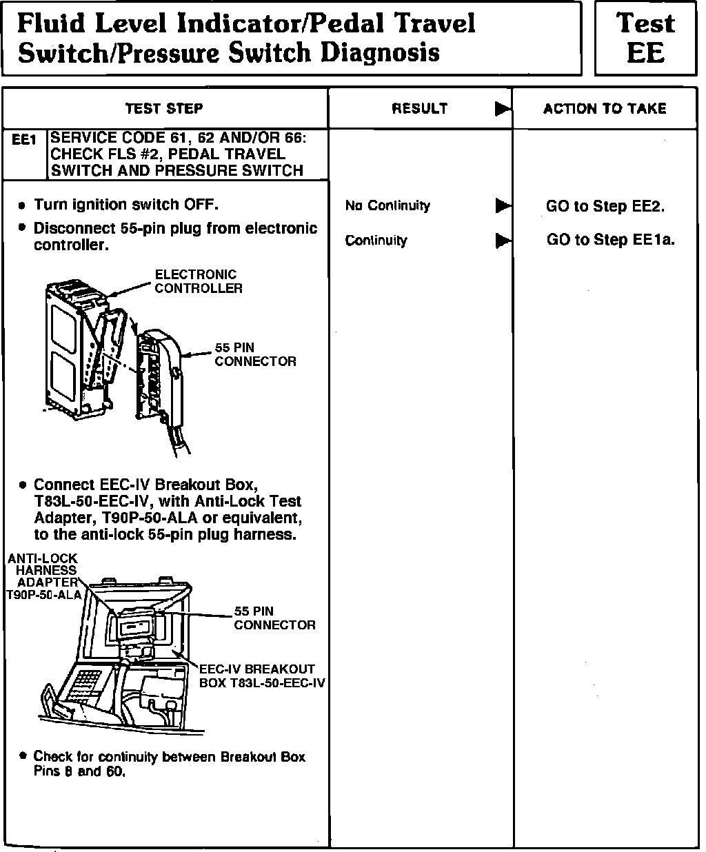 Fig. 56 Test EE1 (Fluid Level Indicator, Pedal Travel Switch & Pump Motor). 1991 Town Car: