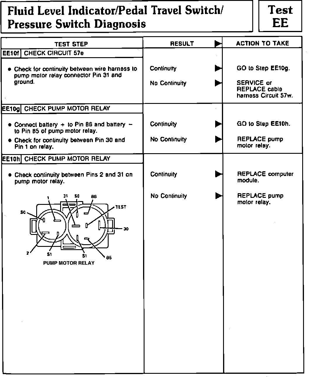 Fig. 81 Tests EE10f, EE10g, EE10h (Fluid Level Indicator/Pedal Travel Switch/Pump Motor). 1991 Town Car:
