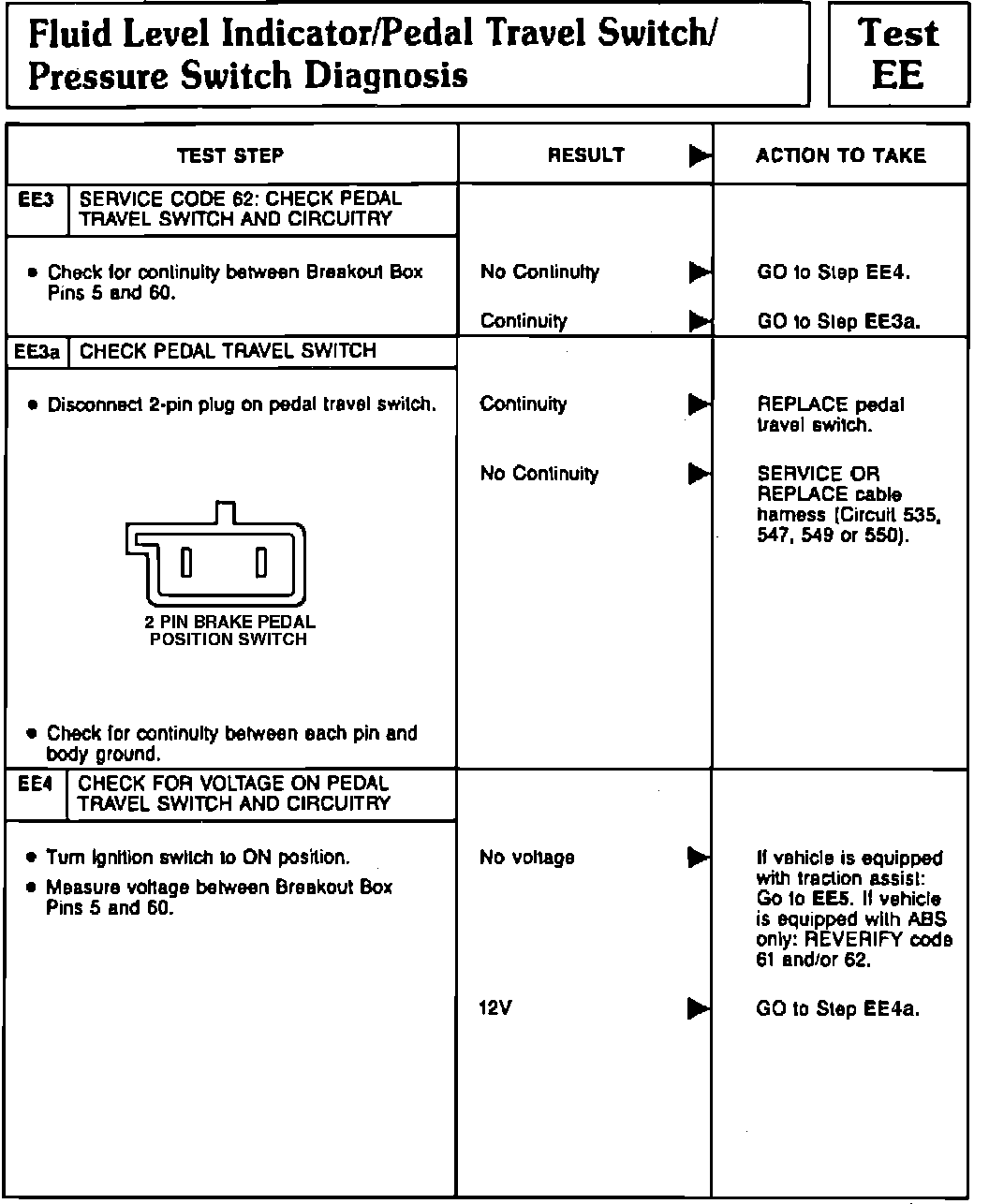 Fig. 61 Tests EE3, EE3a & EE4 (Fluid Level Indicator/Pedal Travel Switch/Pump Motor). 1991 Town Car: