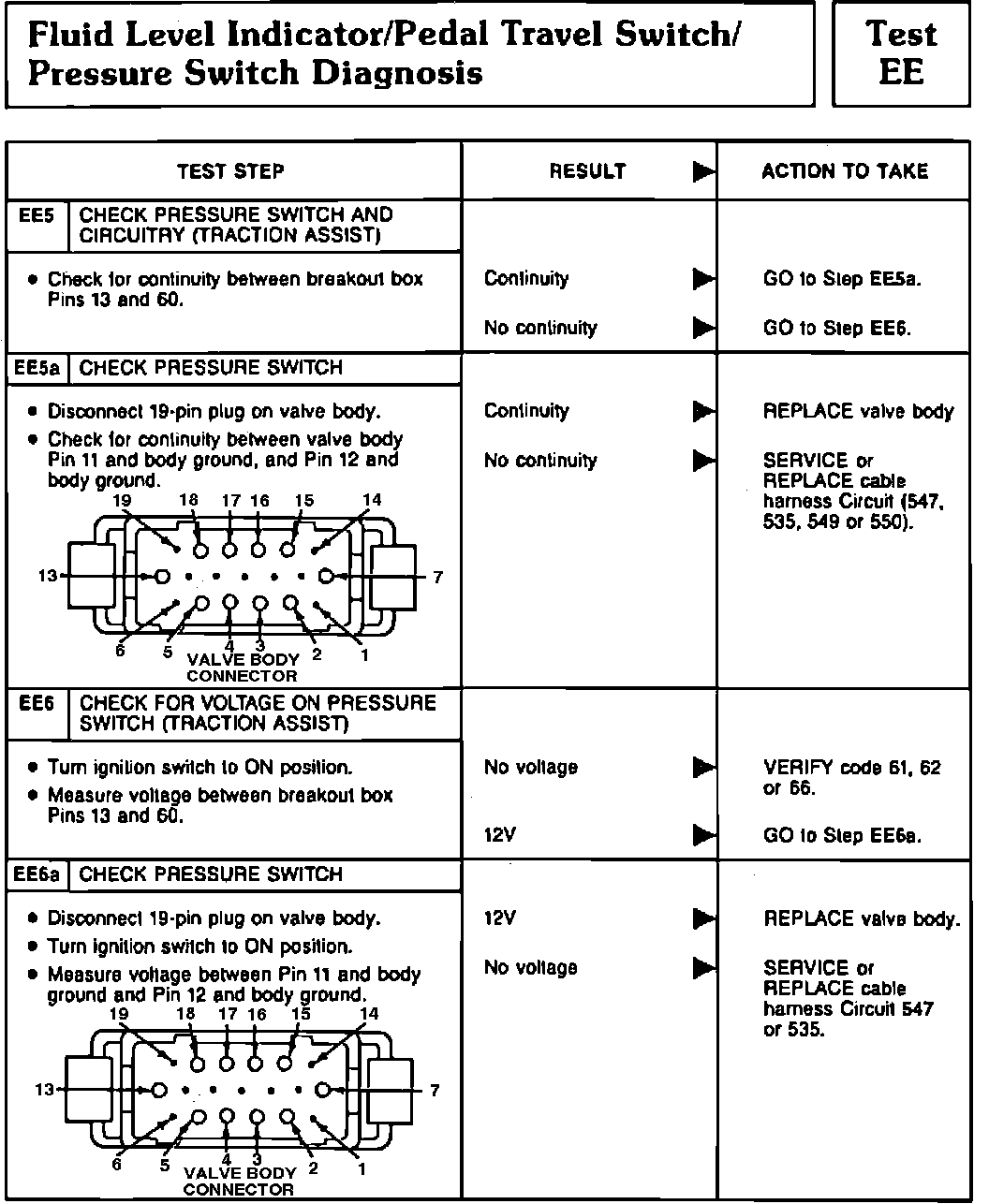 Fig. 65 Tests EE5, EE5a, EE6 & EE6a (Fluid Level Indicator/Pedal Travel Switch/Pump Motor). 1991 Town Car: