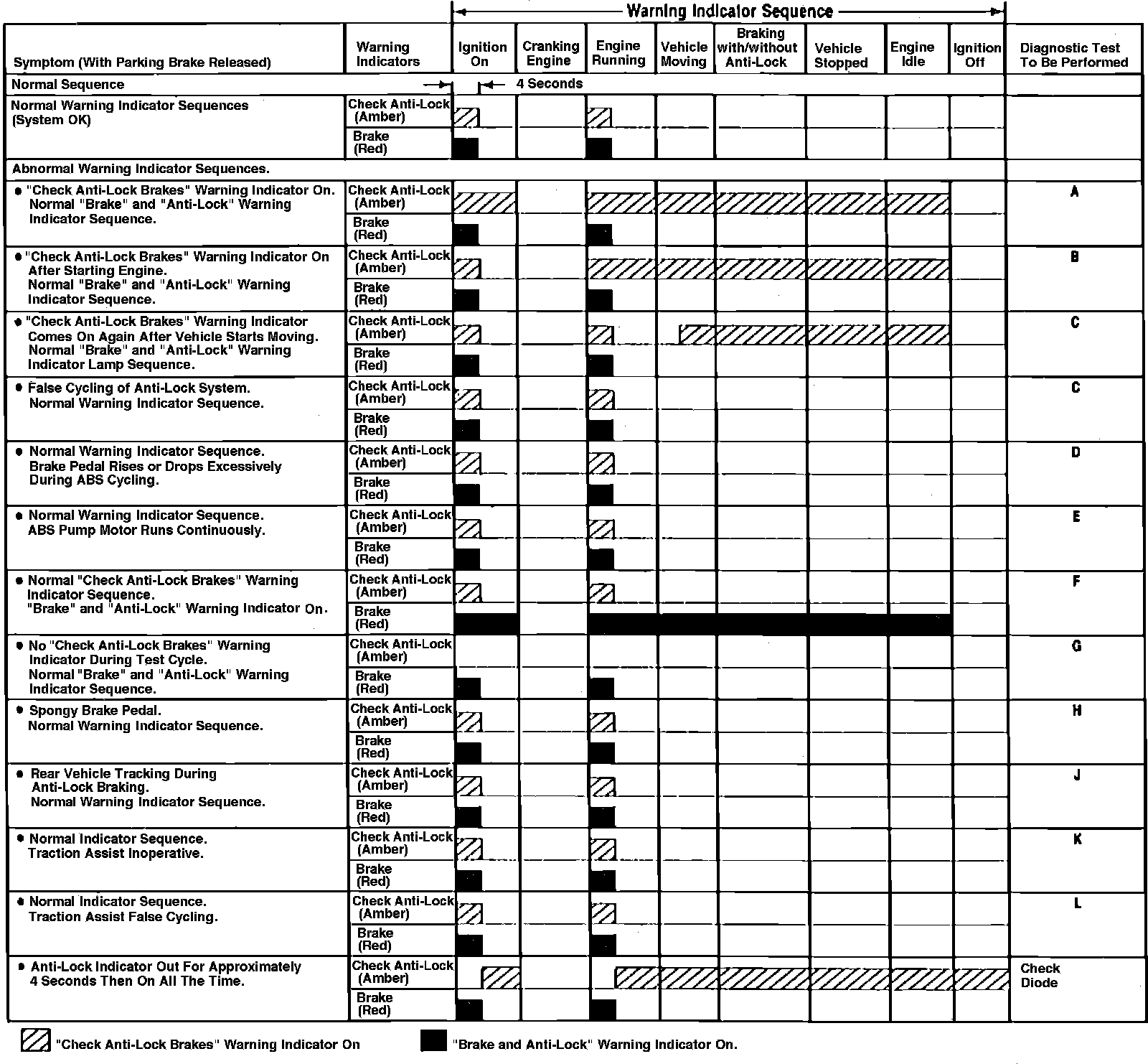 If quick test checks and anti-lock quick check sheet procedure does not isolate the symptom, it will be necessary to check operation of the brake and anti-lock warning lamps. Observe lamps and compare their On/Off operation to conditions listed in Figs. 84 and 85. Once actual warning lamp pattern has been matched to one of conditions listed in chart, perform the specific Pinpoint Test diagnostic procedure.