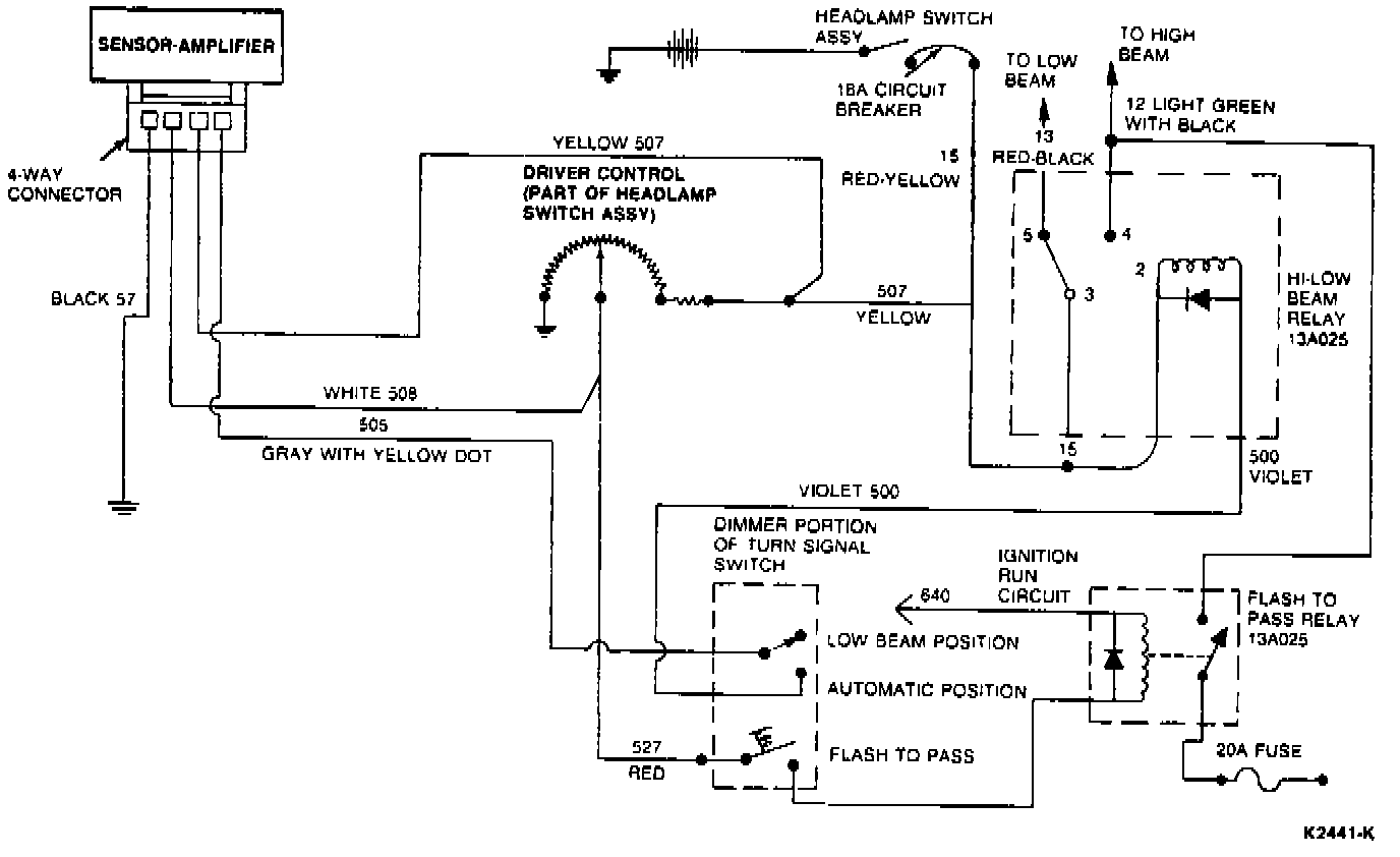 a. Check for a loose connection at the hi-low beam relay, dimmer switch connector near driver sensitivity control, or in-line connector between the sensor-amplifier cable and the interconnecting wire harness.