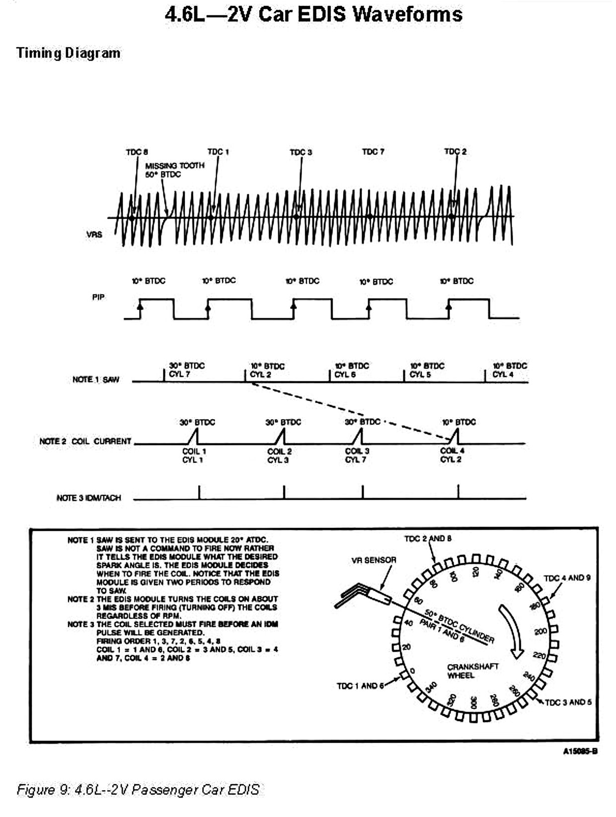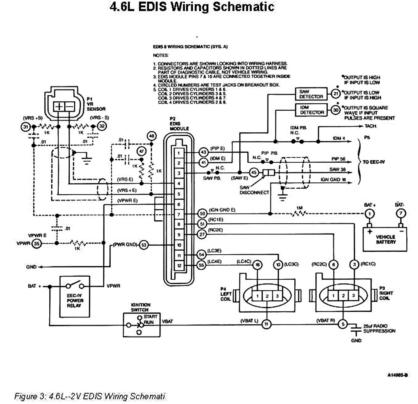 The 4.6L Electronic Distributorless Ignition System (EDIS) consists of a Variable Reluctance Sensor (VRS) an EDIS Ignition Module an EEC-IV processor and two four-tower Coil Packs.