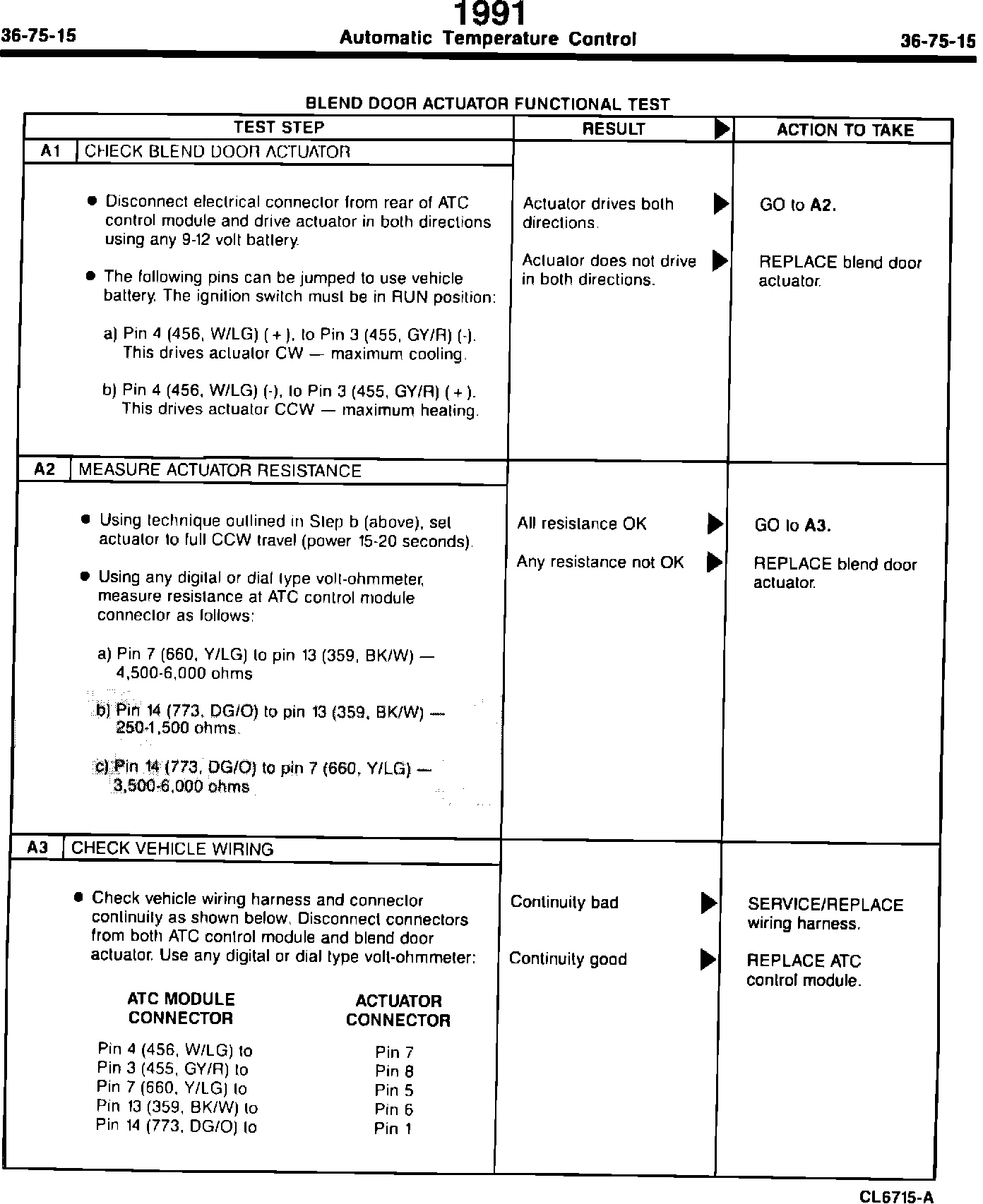 ISSUE: Test Step A2, b) and c), of the Blend Door Actuator Functional Test for Automatic. Temperature Control on Page 36-75-15 of the 1991 Lincoln Town Car/Crown Victoria/Grand Marquis Shop Manual is incorrect. The ohm values shown are reversed.