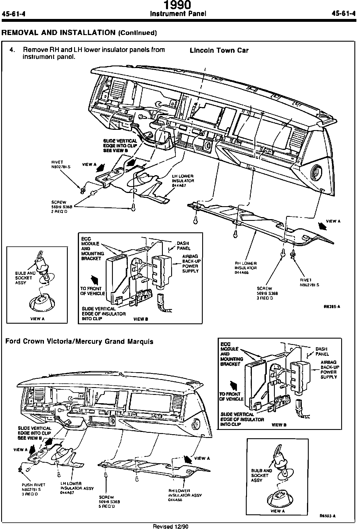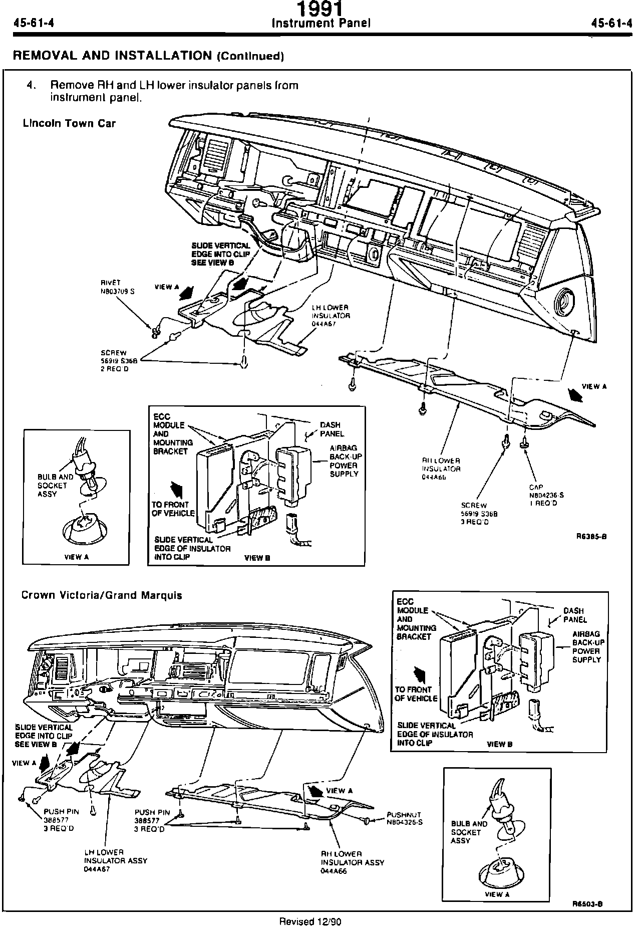 ISSUE: The forward attachment of the left hand sound insulator under the instrument panel is not shown in the illustration on page 45-61-4 of the 1990 and 1991 Lincoln Town Car/Crown Victoria/Grand Marquis Shop Manual.