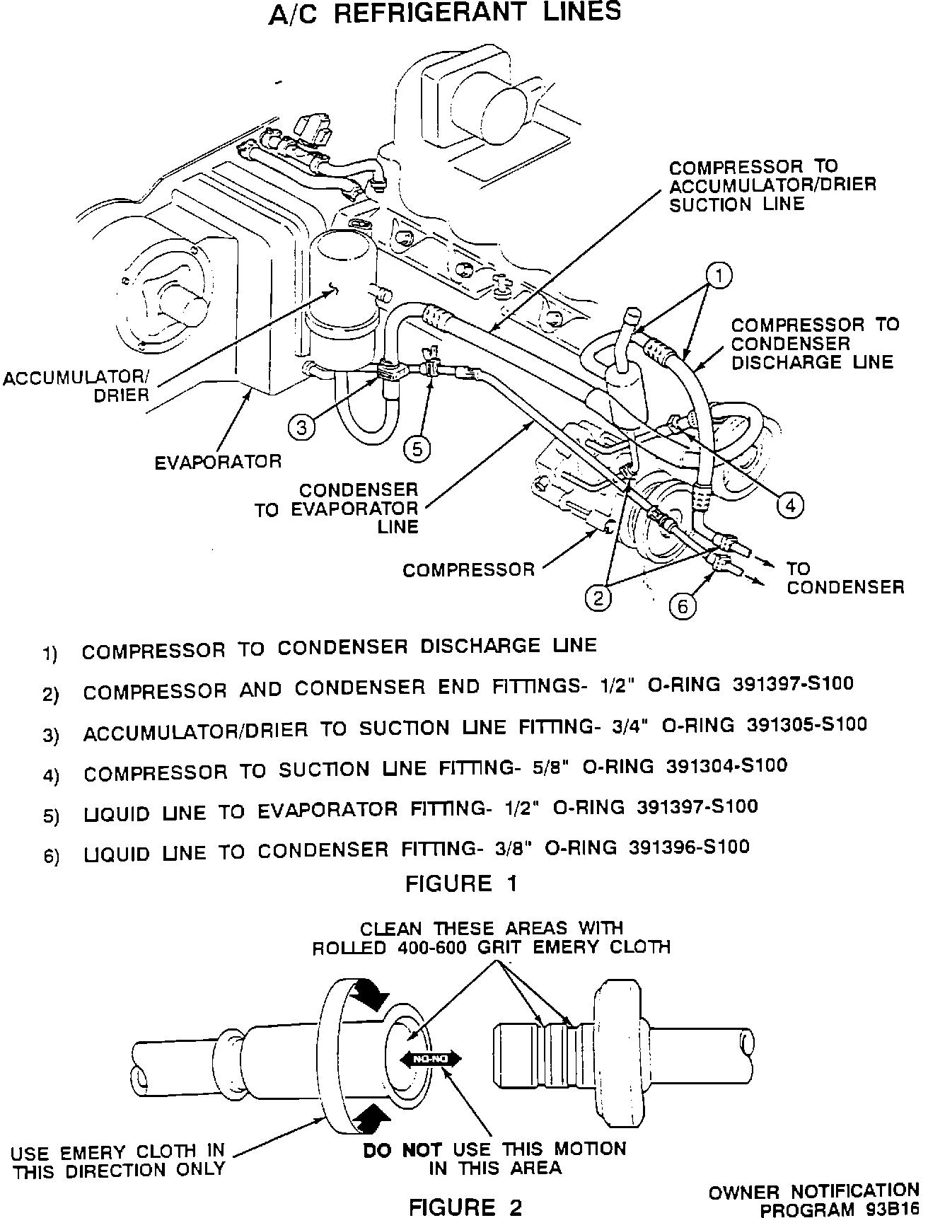 If the discharge line is aluminum, remove it, using spring lock coupling tools No. T81P-19623-G1 and G2. Discard the line. Install a new steel discharge line assembly, Part No. F2VY-19972-A and replace the black o-rings on the condenser connector for the discharge line with green o-rings from the o-ring kit.