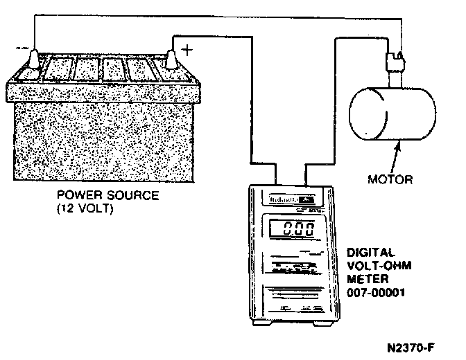 1. Connect an external power source (power-pac or a fully charged battery) to the motor with an ammeter such as Rotunda Digital Volt Ohm Meter 007-00001 or equivalent, in series.