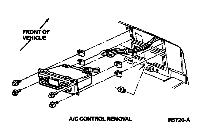 21. Remove four screws retaining A/C control. Disconnect electrical connectors and one vacuum connector.