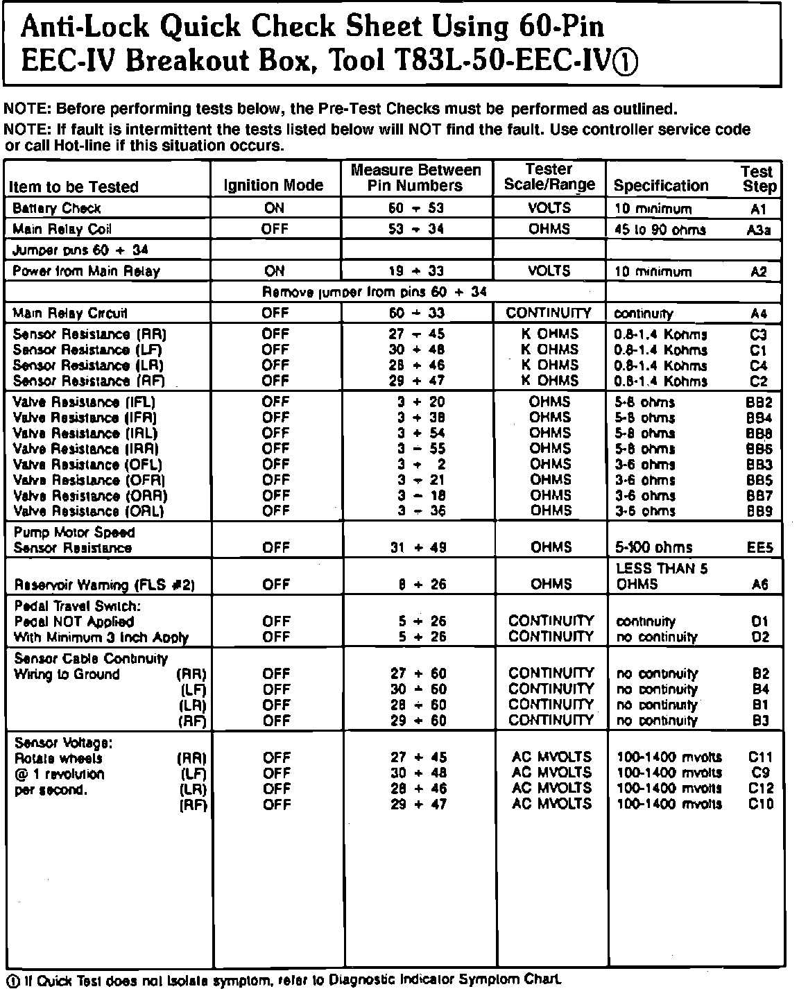To properly conduct Quick Test Checks an EEC-IV breakout box No. T83L-50-EEC-IV, anti-lock harness adapter No. T90P-50-ALA or equivalent and a digital volt/ohmmeter tool No. 007-00001 or equivalent must be used. This group of tests will lead to specific diagnostic Pinpoint Test that will, in most cases, identify the fault/malfunction. If fault/malfunction is not determined by the Quick Test procedure, use the following Diagnostic Lamp Symptom Chart to identify the proper diagnostic procedure to be conducted.