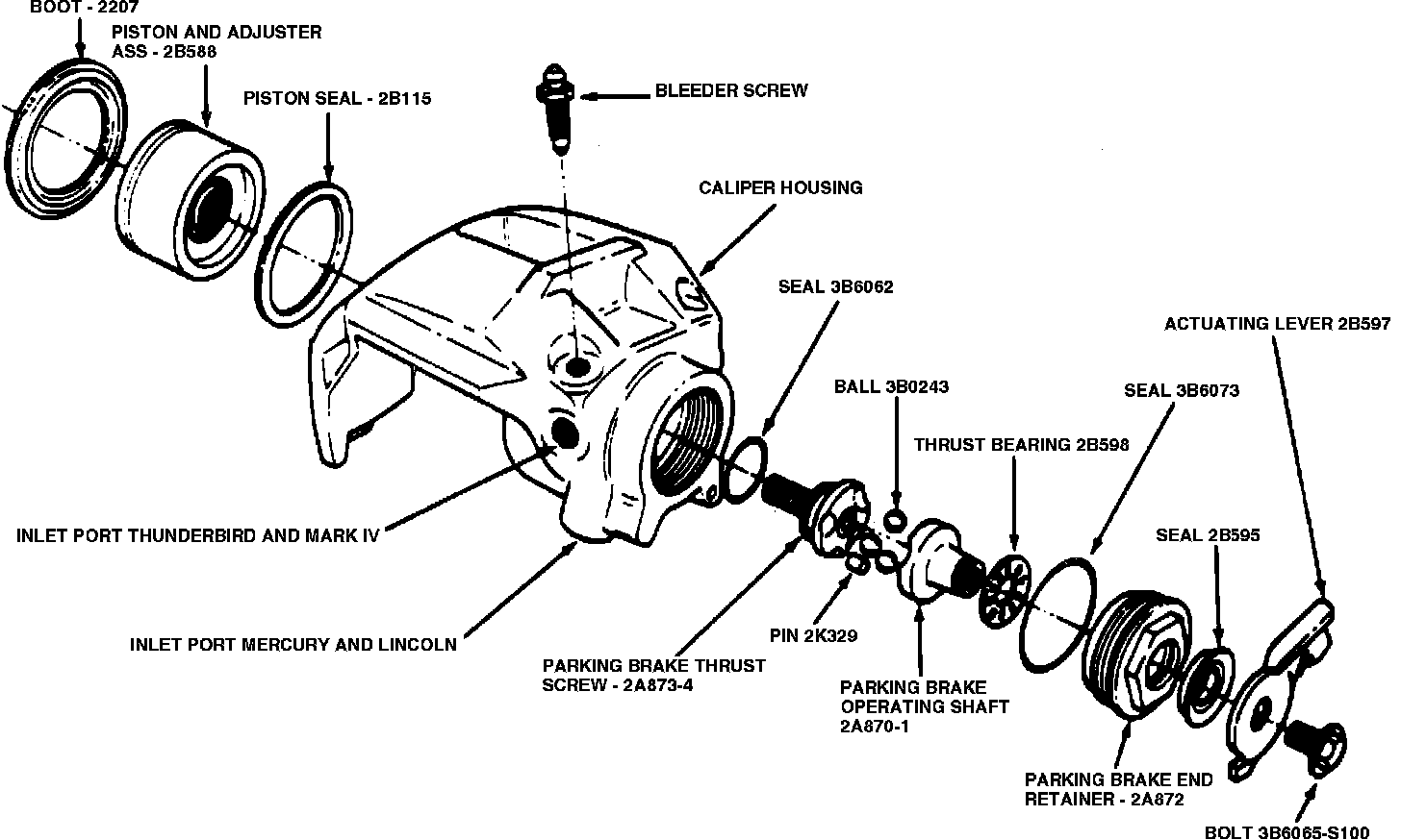 Sliding caliper rear disc brakes are used on Continental, Mark VII & Thunderbird, Figs. 1 and 2. The caliper is basically the same as the larger front wheel caliper, however, a parking brake mechanism and a larger inner brake shoe anti-rattle spring have been added.