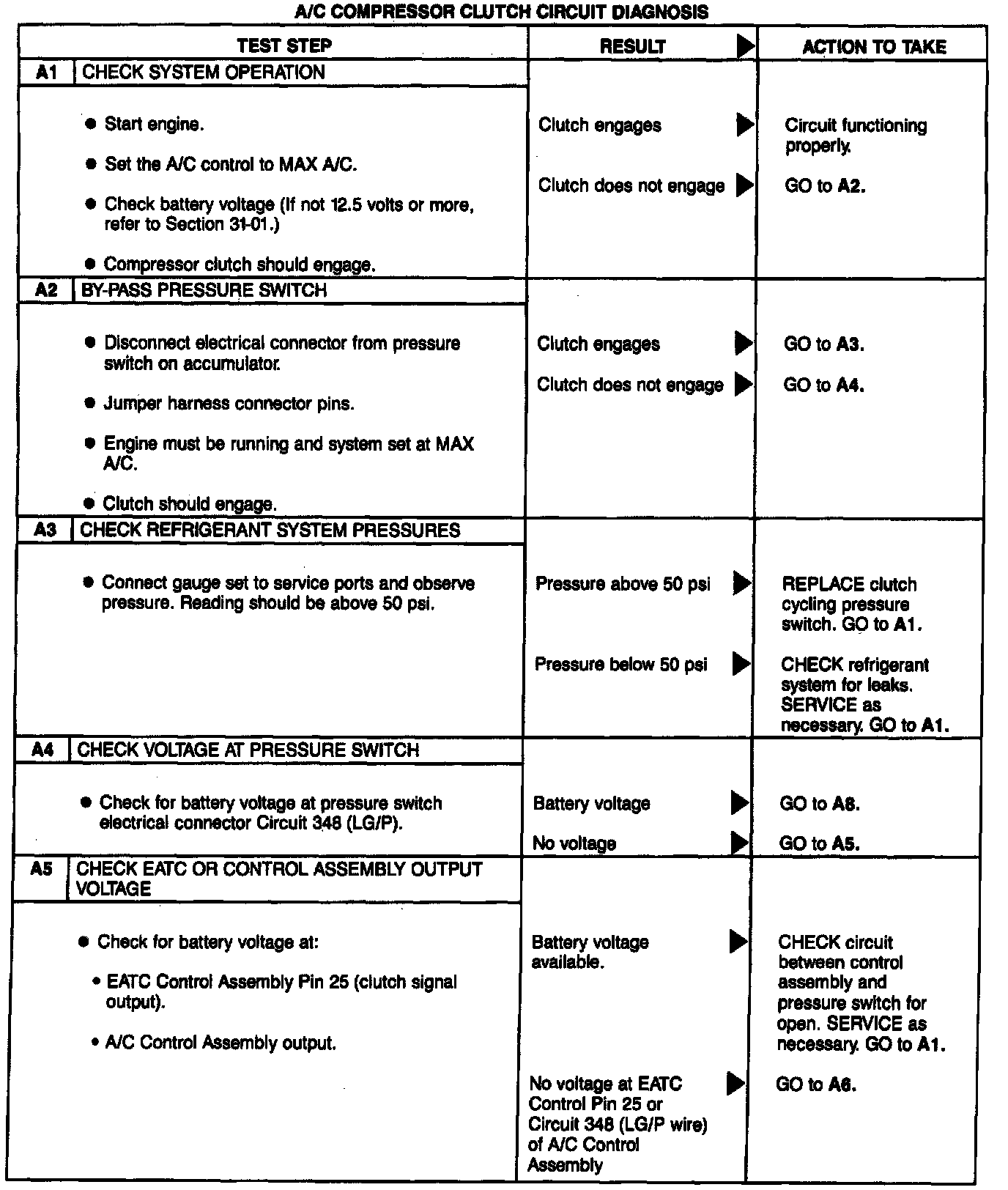 Follow the diagnostic procedures in the following illustrations and, if necessary, refer to the Quick Tests and Pinpoint Tests to correct an inoperative compressor clutch condition. The ambient temperature must also be above approximately 10°C(50°F) for the A/C compressor to operate.
