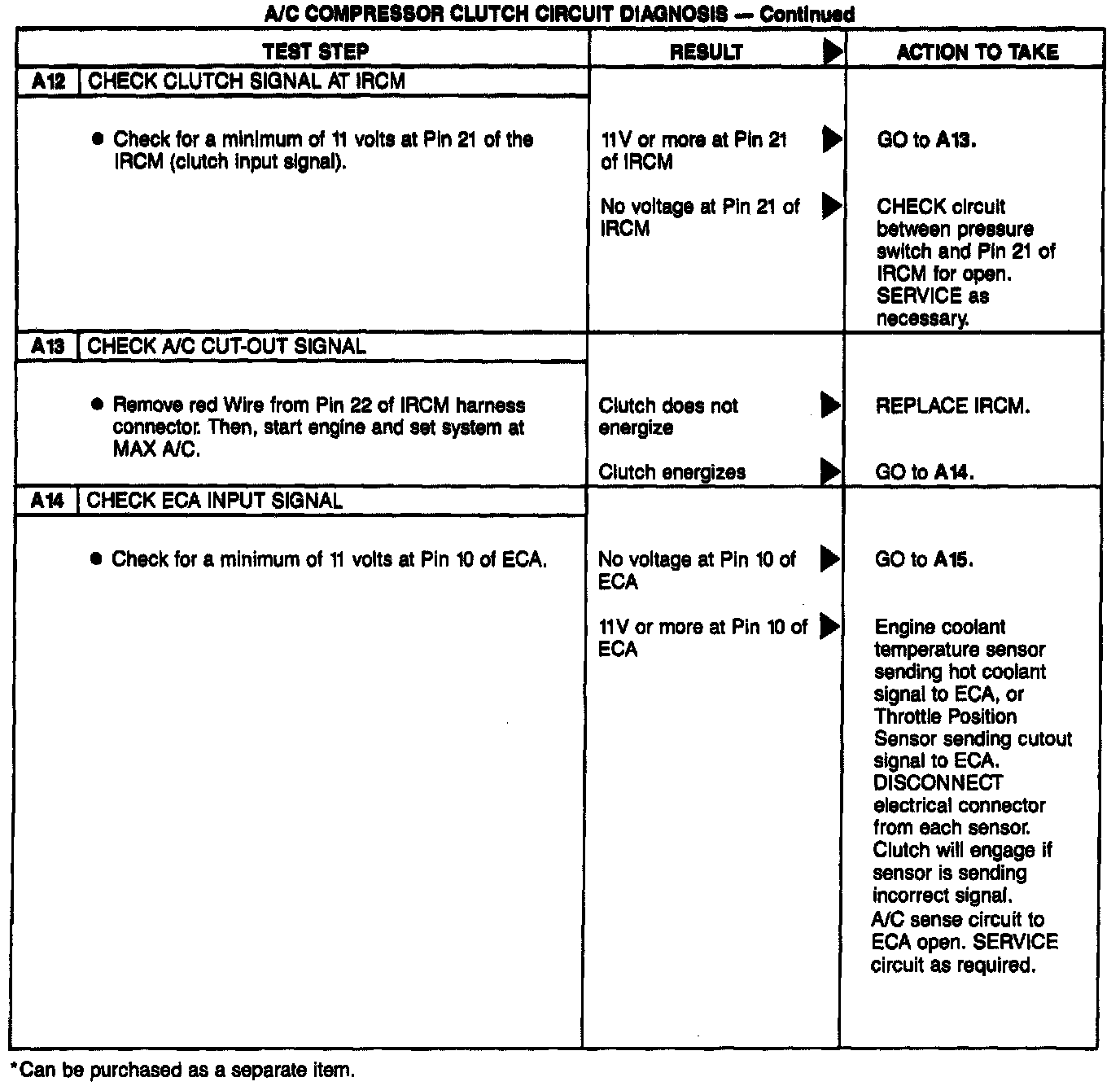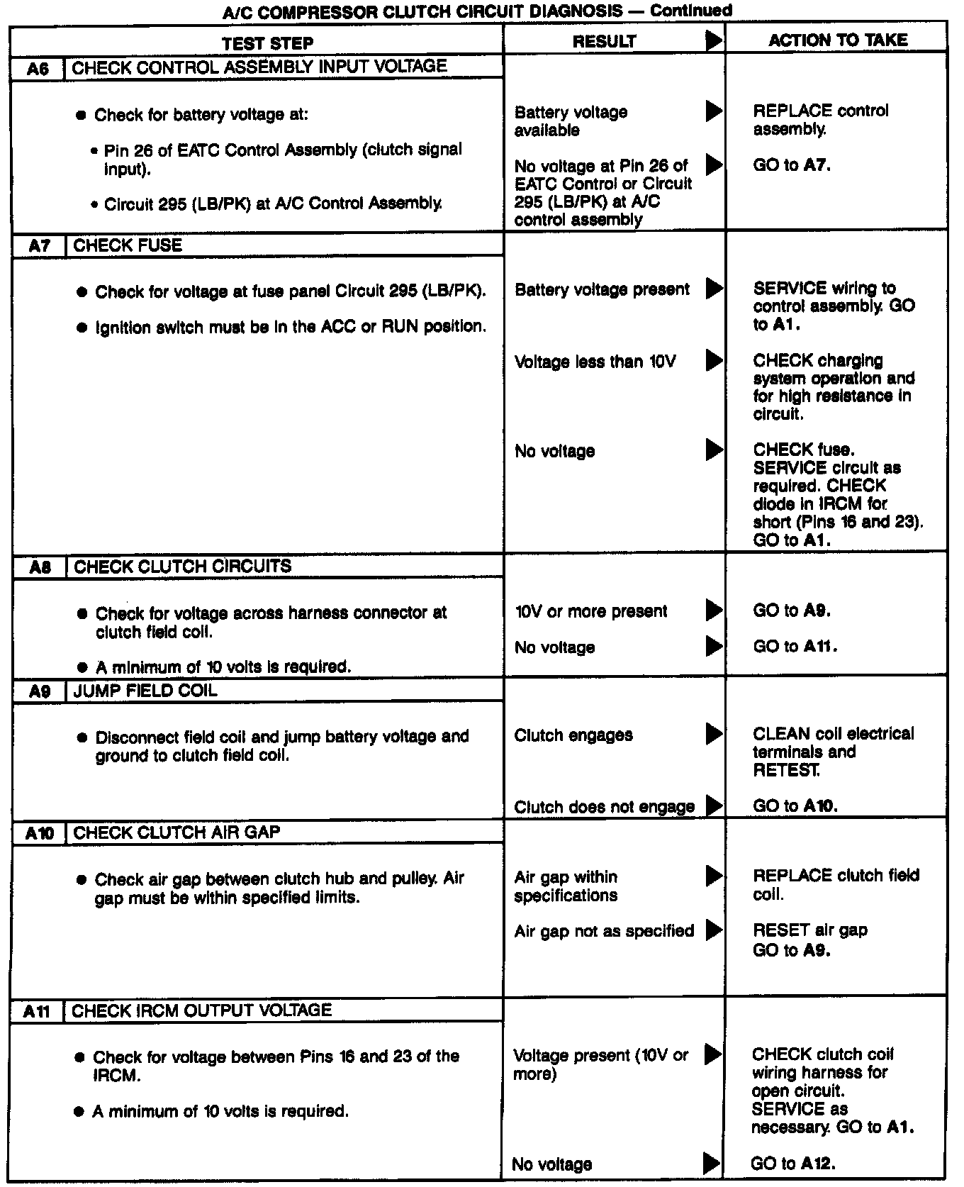 COMPRESSOR CLUTCH CIRCUIT OPERATION FOR TESTINGOperation of the A/C compressor clutch is dependent on the ambient temperature and signals from the engine computer. The engine computer will interrupt A/C compressor operation when certain conditions exist. The A/C compressor clutch can be shut off (or kept off) for several seconds at engine start-up, at high engine speeds, during acceleration, when the engine coolant temperature exceeds a predetermined temperature and during low engine idle conditions.