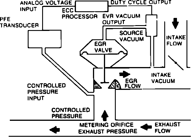 The PFE system is a subsonic closed loop EGR system that controls Exhaust Gas Recirculation by monitoring the exhausts pressure drop across a remotely located sharp-edged orifice. The system uses a pressure transducer/sensor to send a returning analog voltage signal to the ECA. The ECA controls the varying pressure by modulating the vacuum output of the EGR Vacuum Regulator (EVR) Solenoid.