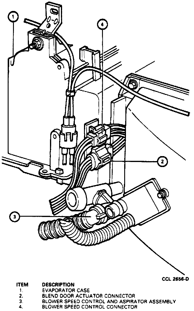 2. Working through glove compartment opening, disconnect electrical snap-lock connector and aspirator hose at blower motor controller (illustration).