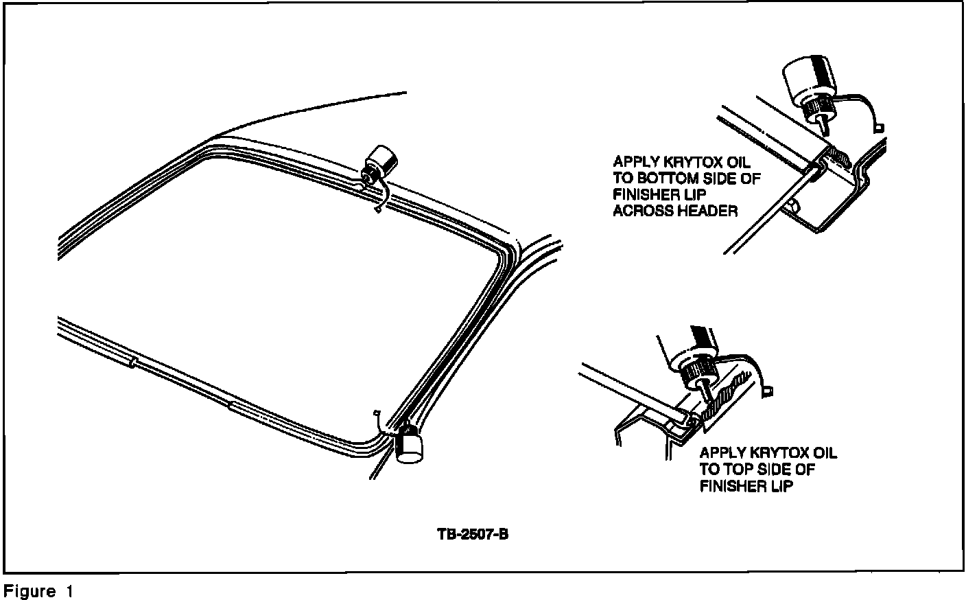 Apply "Krytox Oil" lubricant to the top surface of the windshield moulding finisher lip along the "A" pillars. Also apply "Krytox Oil" to the bottom surface of the finisher lip across the windshield. Refer to Figure 1.