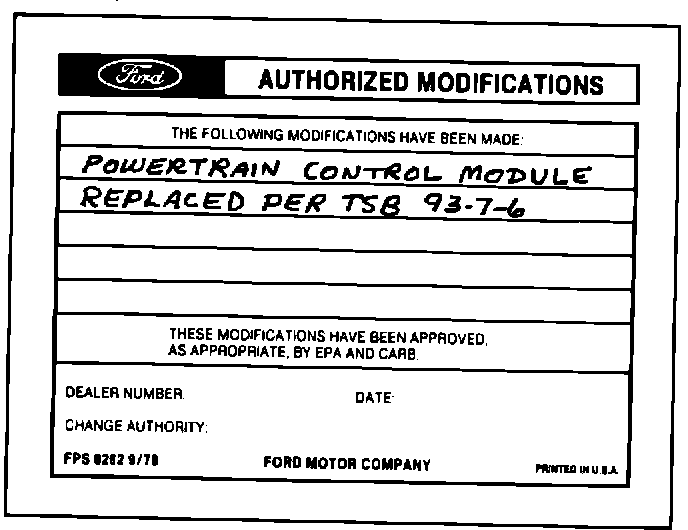 Obtain an Authorized Modifications Decal and list the date, dealer number, and summary of alterations performed. Select a prominent place adjacent to the Vehicle Emission Control Information Decal suitable for installing the Authorized Modifications Decal. Clean the area, install the decal, and cover it with a clear plastic decal shield.