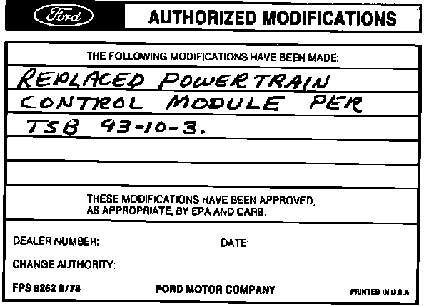 Obtain an Authorized Modifications Decal and list the date, dealer number, and summary of alterations performed. Select a prominent place adjacent to the Vehicle Emission Control Information Decal suitable for installing the Authorized Modifications Decal. Clean the area, install the decal, and cover it with a clear plastic decal shield.