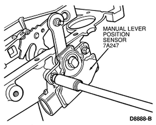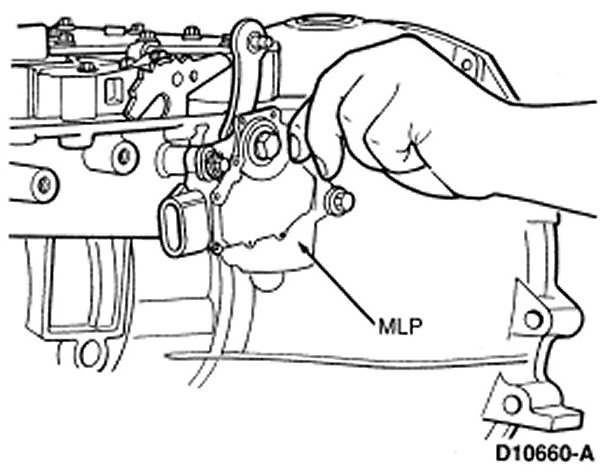 5. Using 8mm socket, remove two bolts retaining manual lever position (MLP) sensor to case. Remove MLP sensor from manual shaft.