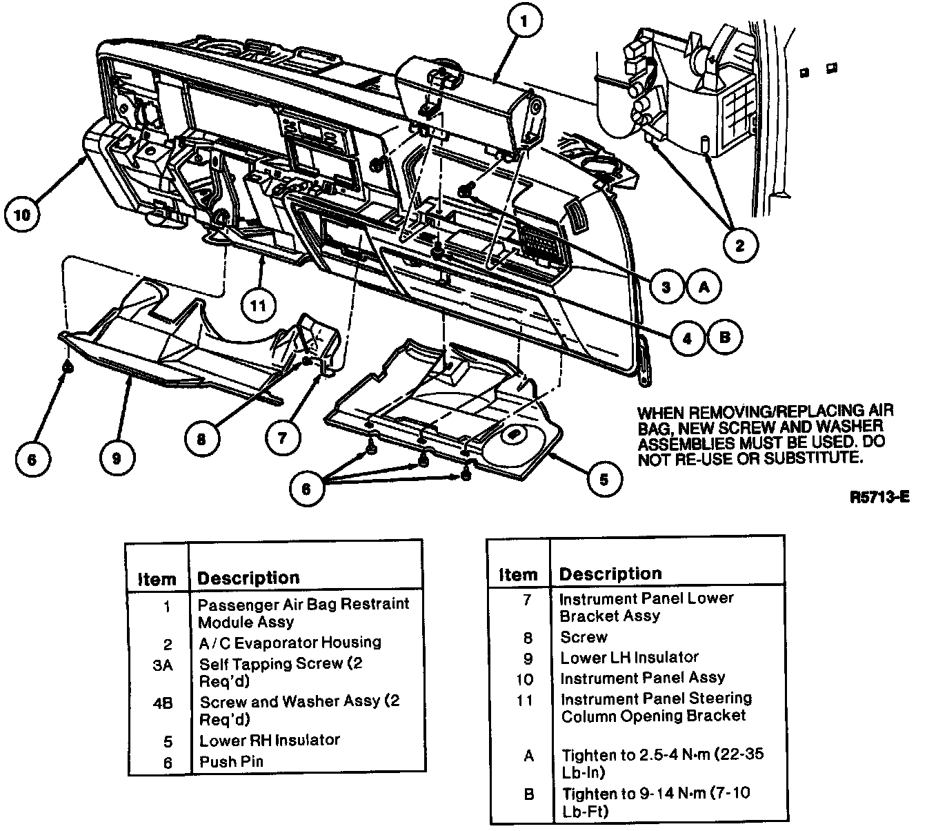 24. Remove two screws from instrument panel to cowl top brace and one screw from passenger air bag support bracket.