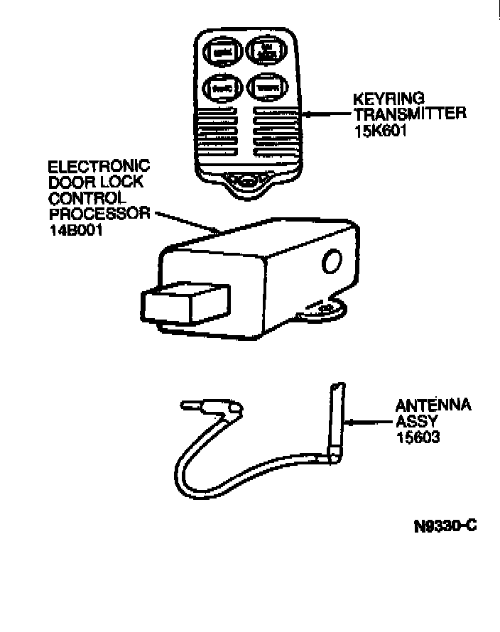 The electronic door lock control system has four main components: the electronic door lock control processor, located under the package tray in the luggage compartment, the five-button door lock switch actuator on the driver's door, the antenna located under the C-pillar trim panel and the four button (hand-held) transmitter.