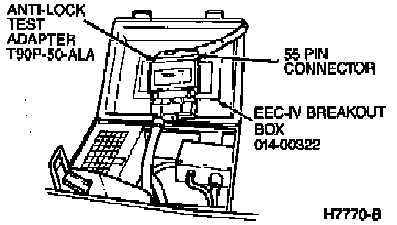 - Connect Rotunda EEC-IV breakout box 014-00322 with Anti-Lock Test Adapter T90P-50-ALA or equivalent to the anti-lock 55-pin connector on wire harness.