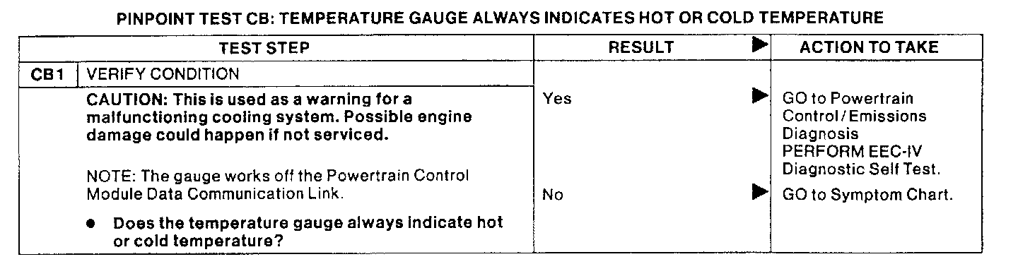 PINPOINT TEST CB: TEMPERATURE GAUGE ALWAYS INDICATES HOT OR COLD TEMPERATURE.: