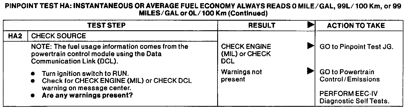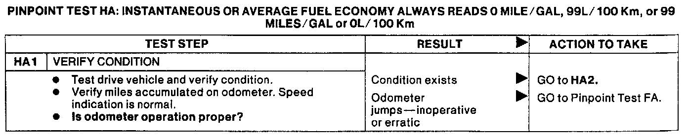 PINPOINT TEST HA: INSTANTANEOUS OR AVERAGE FUEL ECONOMY ALWAYS READS O MILE/GAL, 99L/100Km, OR 99 MILES/GAL OR OL/100Km: