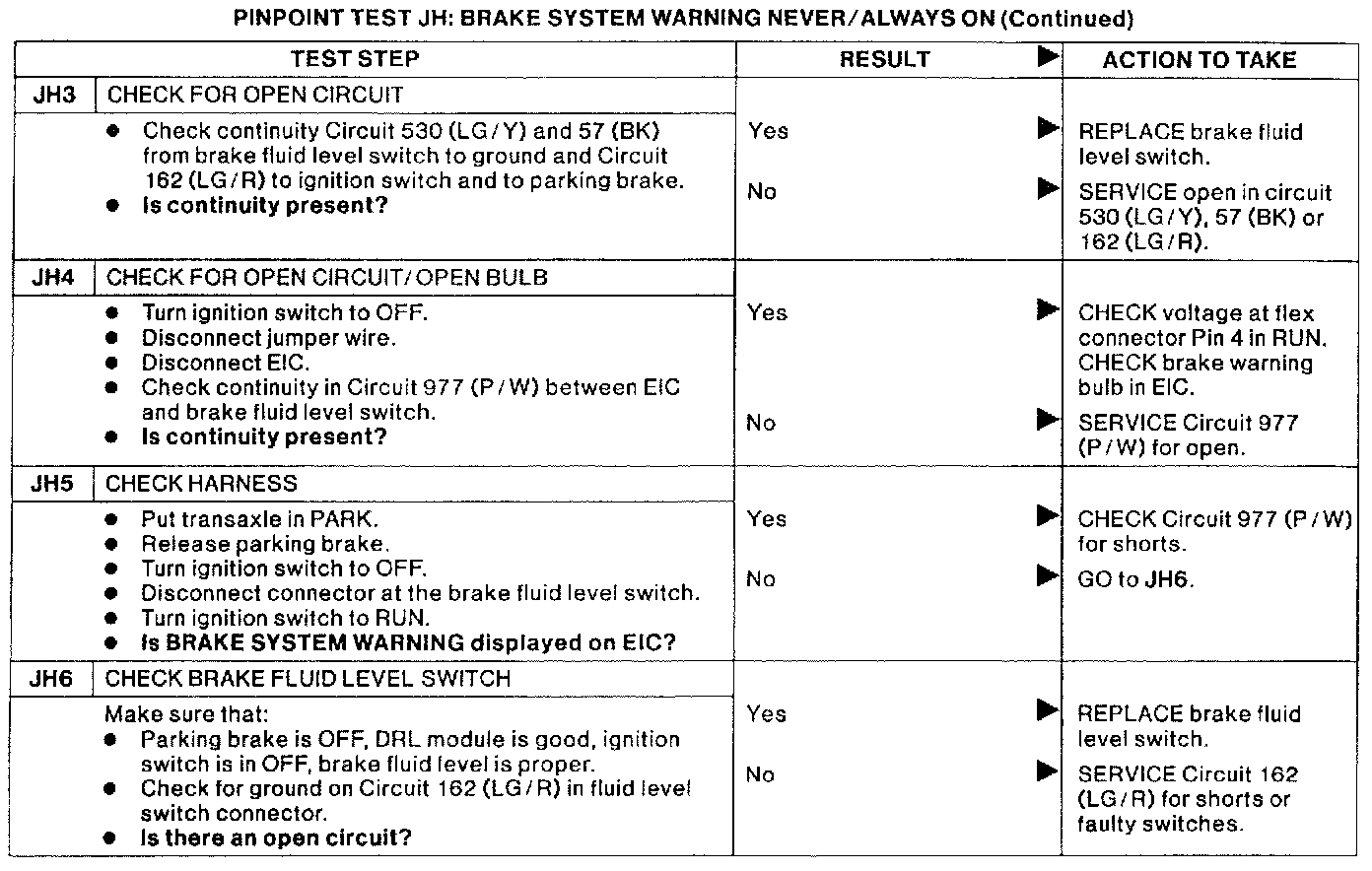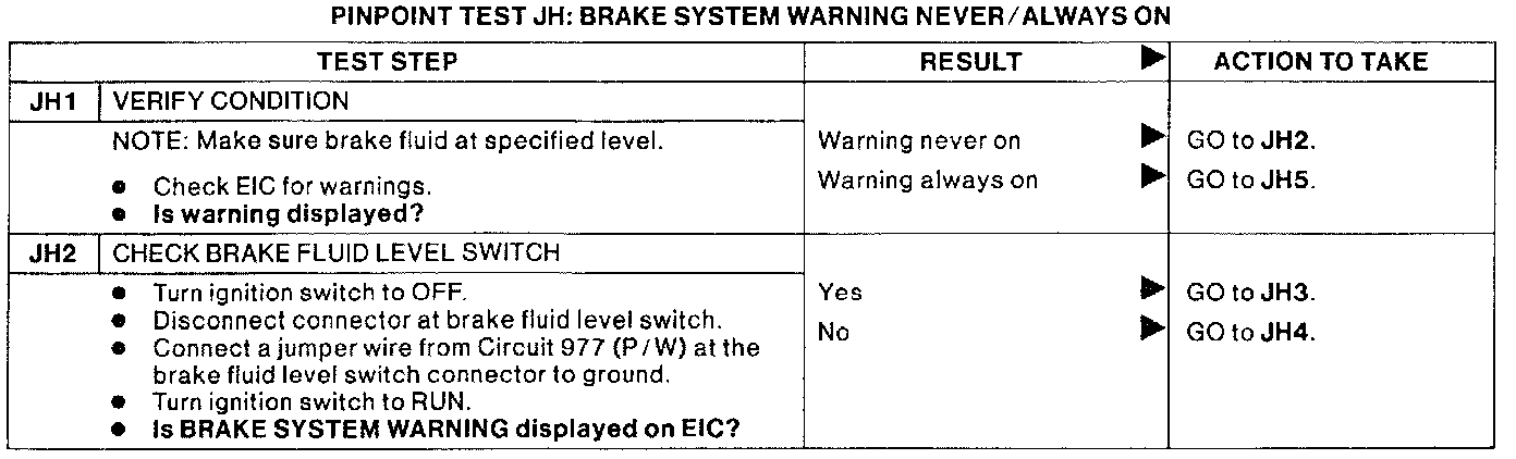 PINPOINT TEST JH: BRAKE SYSTEM WARNING NEVER/ALWAYS ON.: