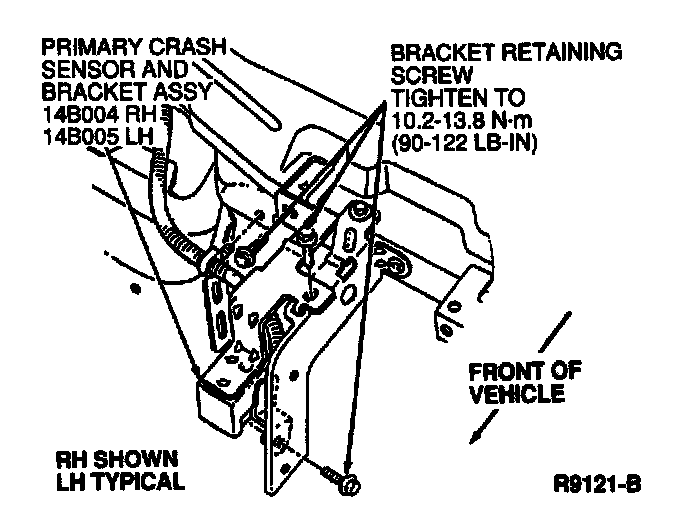 1. Position RH/LH front primary crash sensor and wire lead in vehicle and secure sensor to RH/LH fender apron with two retaining screws. Tighten screws to 10.2-13.8 Nm (90-122 in lbs).
