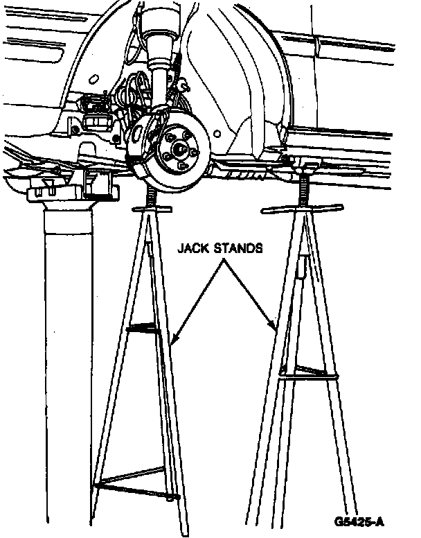 4. Raise vehicle on a twin post hoist and remove front wheel and tire assemblies.