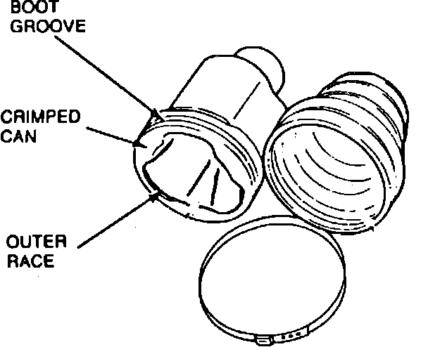 NOTE: Two different types of inboard CV joints and boots are used. The conventional style uses a crimped can on the large end. The trilobe style CV joint does not require a crimped can on the large end. Although the designs are similar, there are no interchangeable components between the two designs. The CV joint tripot, outer race, boot and interconnecting shaft are unique for each style.