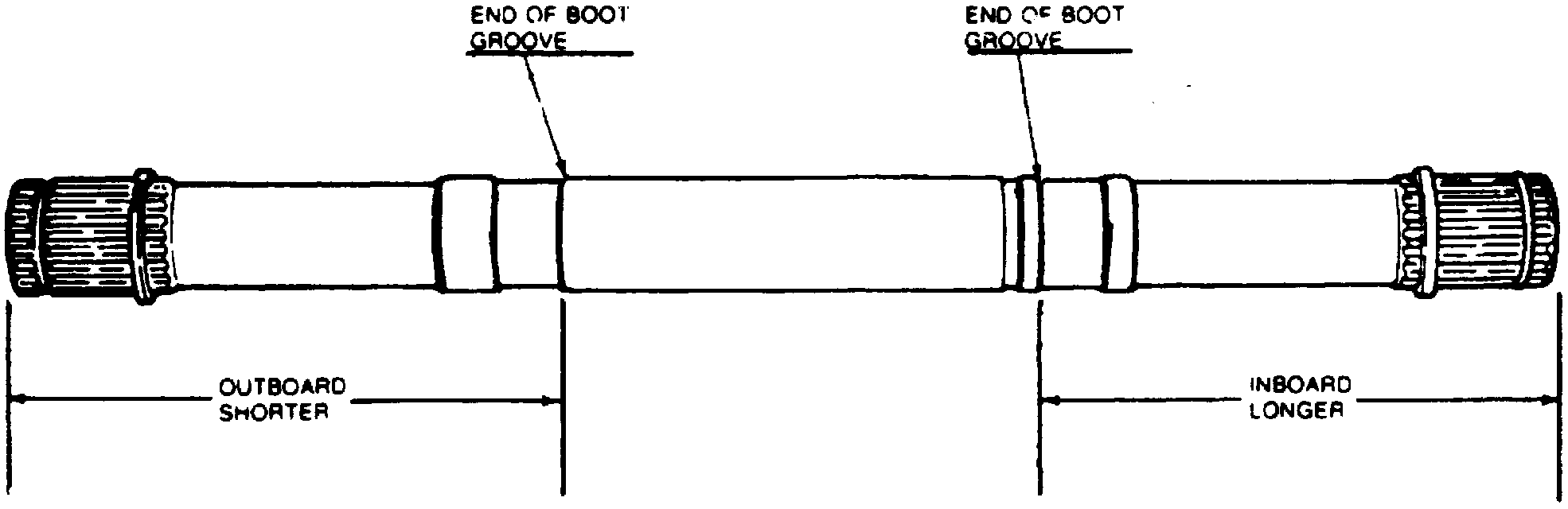 7. The lefthand and righthand interconnecting shafts are not the same end-for-end. The outboard end is shorter from end of shaft to end of boot groove than the inboard end. Take a measurement to ensure proper inboard and outboard CV joint to shaft installation.