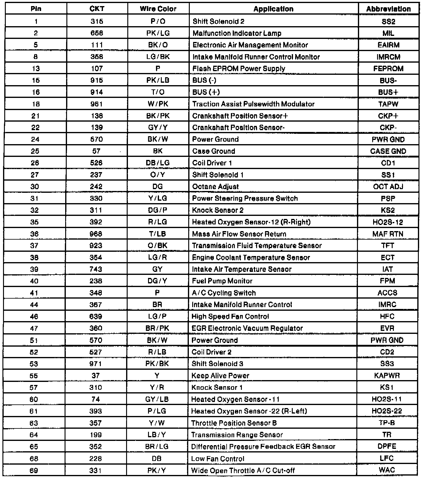 Powertrain Control Module (PCM) Connector Pin Usage (Part 1 Of 2):
