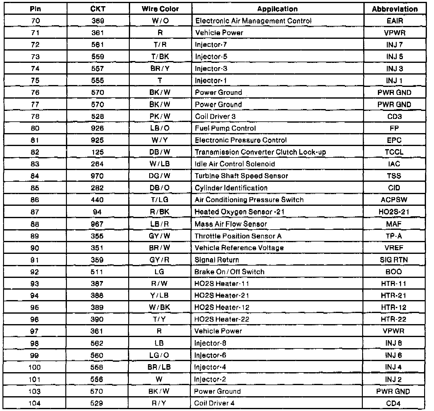 Powertrain Control Module (PCM) Connector Pin Usage (Part 2 Of 2):