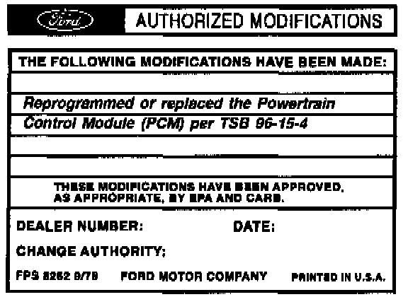 Obtain an Authorized Modifications Decal and list the date, dealer number, and summary of modifications performed. Select a prominent place adjacent to the Vehicle Emission Control Information Decal suitable for installing the Authorized Modifications Decal. Clean the area, install the decal, and cover it with a clear plastic decal shield.