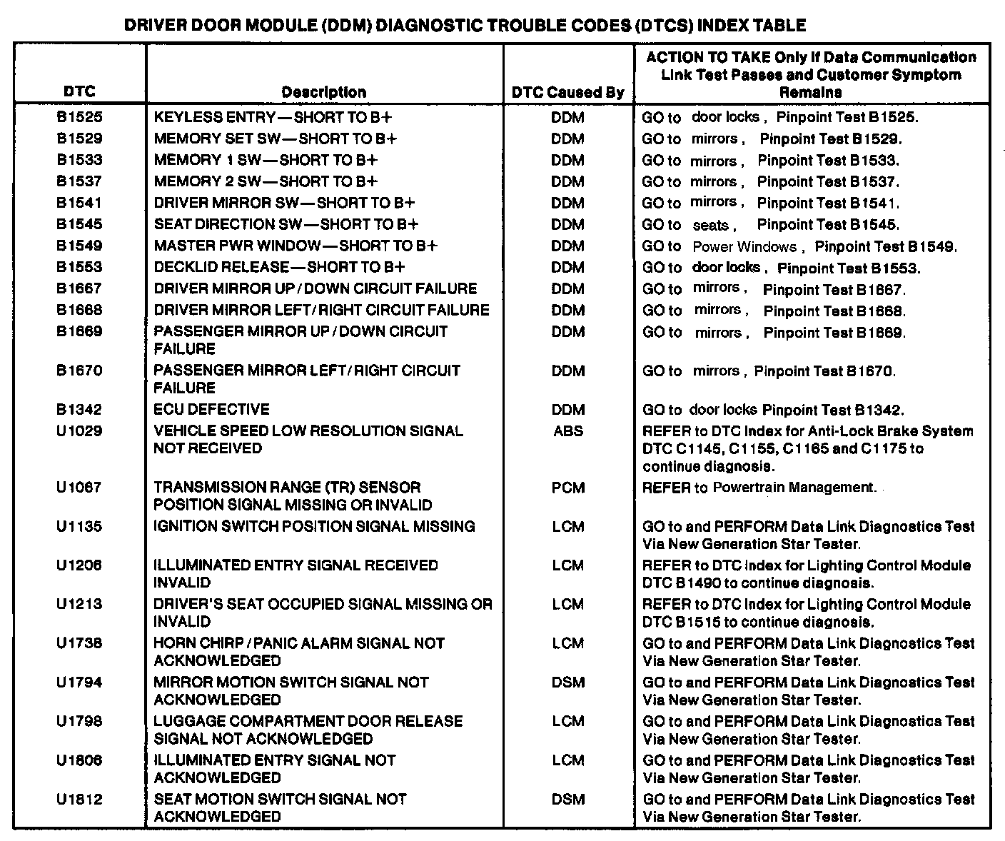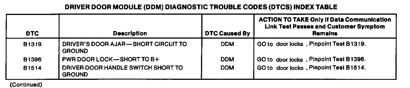 Driver Door Module DTC Chart