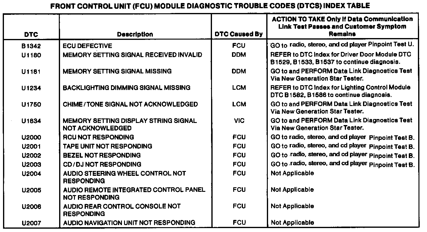 Front Control Unit DTC Chart