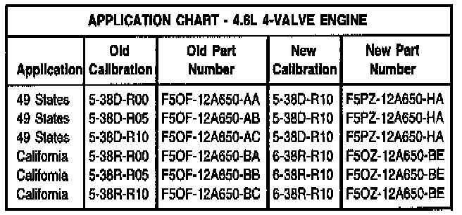 2. Reprogram or replace the PCM. Dealers with SBDS are required to reprogram the PCM with the appropriate calibration per the Application Chart using the latest calibration update 1996 CD-ROM or later. Dealers without SBDS, refer to the Application Chart to determine the correct PCM.