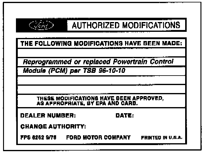 Obtain an Authorized Modifications Decal and list the date, dealer number, and summary of modifications performed. Select a prominent place adjacent to the Vehicle Emission Control Information Decal suitable for installing the Authorized Modifications Decal. Clean the area, install the decal, and cover it with a clear plastic decal shield.
