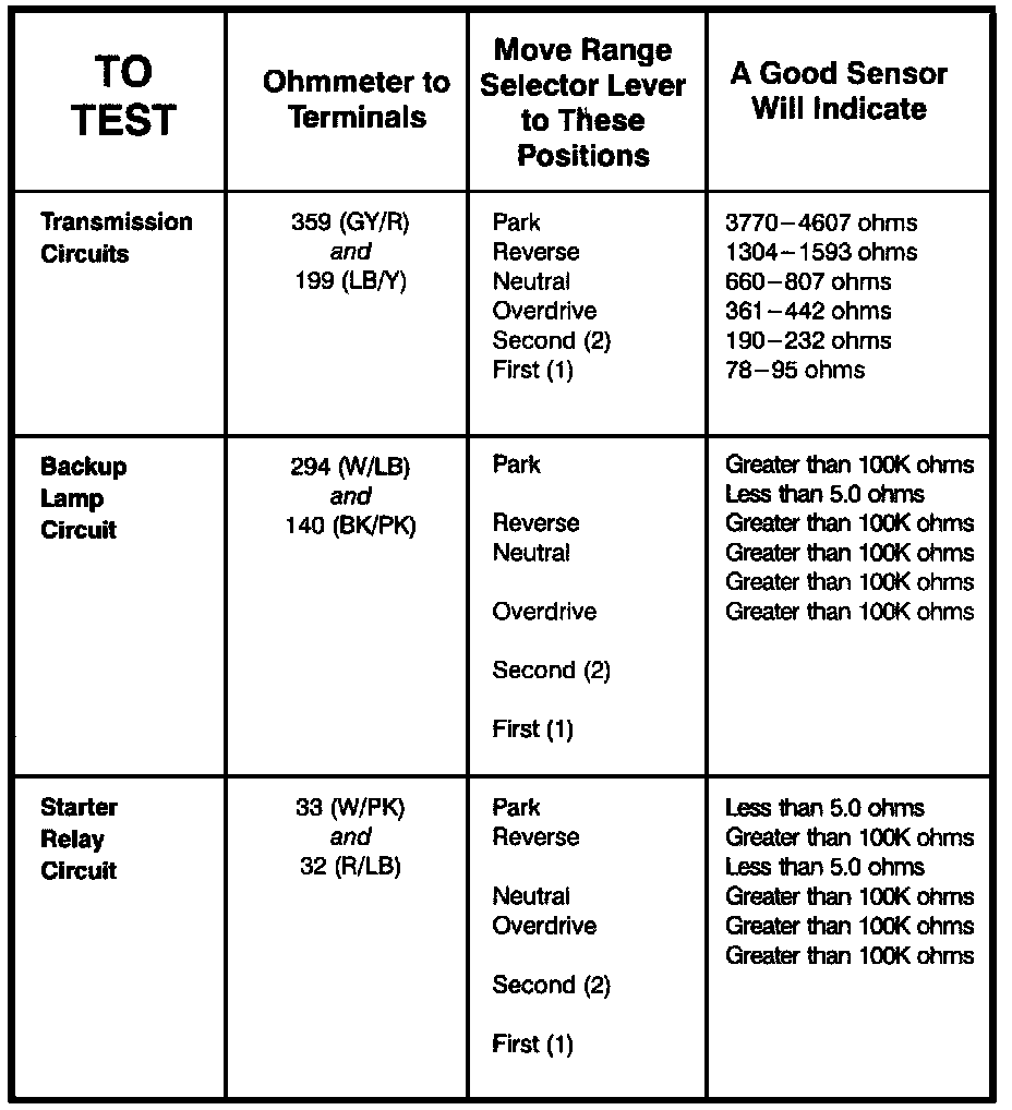 Transmission Range Sensor - Component Testing Procedure: