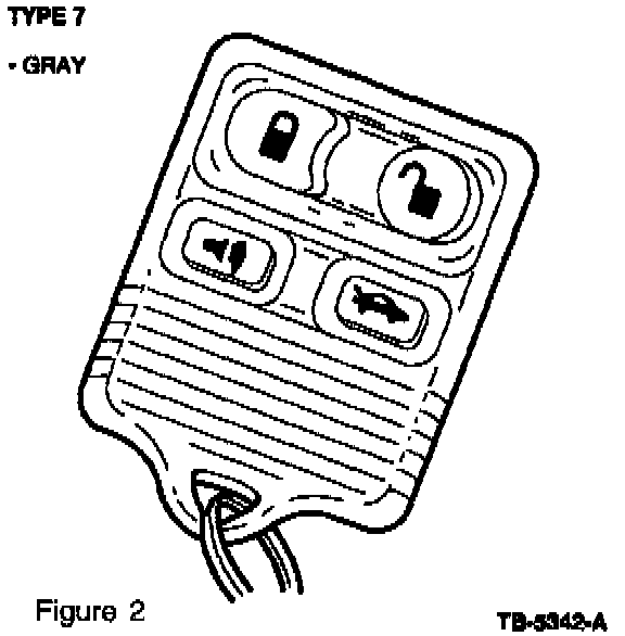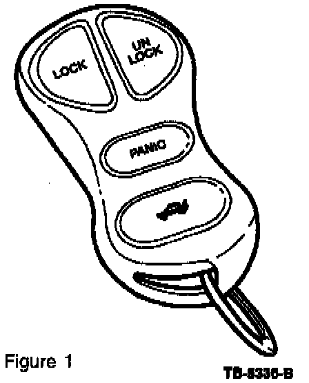 Refer to Figure 1 ("peanut" design) and Figure 2 (revised design) to note the differences of the RKE transmitters. The revised RKE transmitter is significantly different in appearance, but provides the same functionality as the "peanut" style RKE transmitter. These transmitters are fully compatible and interchangeable. If replacing a transmitter, it is NOT necessary to replace both transmitters.