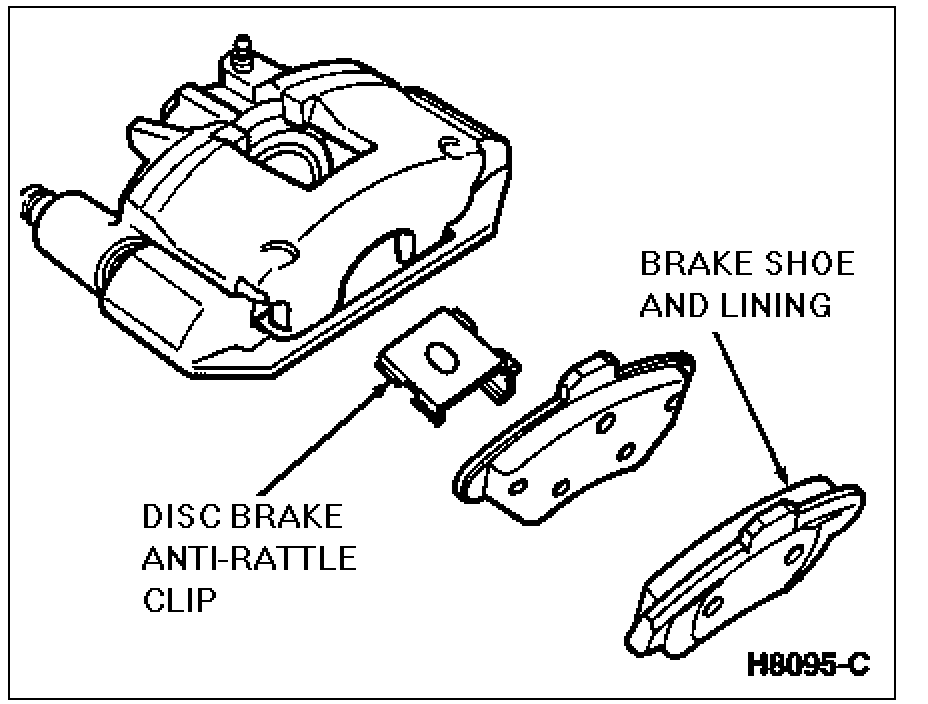 6. Inspect disc brake caliper/front disc brake caliper anchor plate assembly to make sure brake shoes and linings are properly installed and that arrows are pointing toward front of vehicle, and that brake shoe and lining faces front disc brake rotor.
