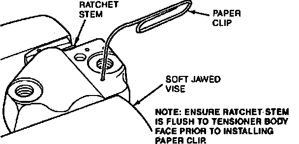 4. While holding ratchet stem flush to tensioner face, release ratchet lock mechanism, then install paper clip or suitable tool to lock tensioner in collapsed position.