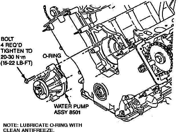 5. Reverse procedure to install. Torque water pump and water pump pulley attaching bolts to 15-22 ft lb.
