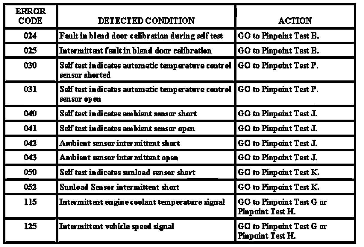 - The EATC Self Test will detect concerns in the system control functions found during the Self Test and will display these error codes in addition to intermittent error codes for concerns that occur during system operation. The vehicle interior temperature should be between 60° F and 80° F when performing the Self Test. If the temperatures are not within the specified ranges, false in-car temperature sensor error codes will be displayed. Record all error codes displayed during the test.