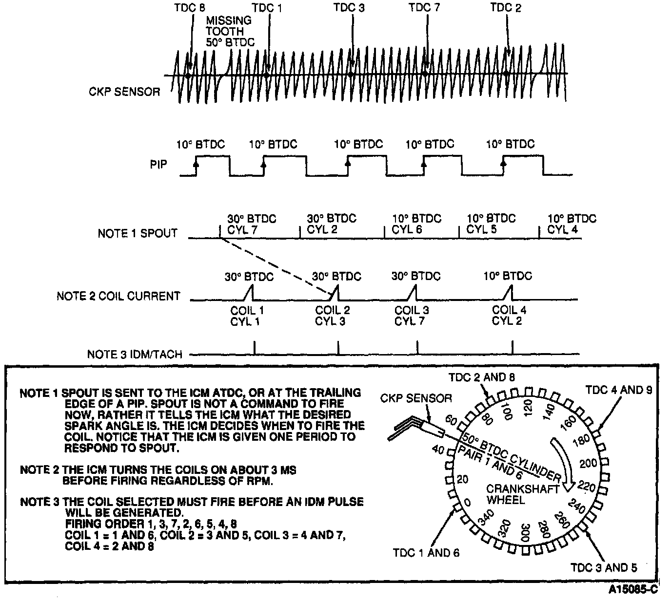 As the teeth on the crankshaft pass by the CKP a voltage is induced in the sensor. The CKP output is a spiked sine wave that is proportional to crankshaft speed and position. The missing tooth (36 minus 1) design allows the ICM to synchronize the signal and select the correct coil to fire.