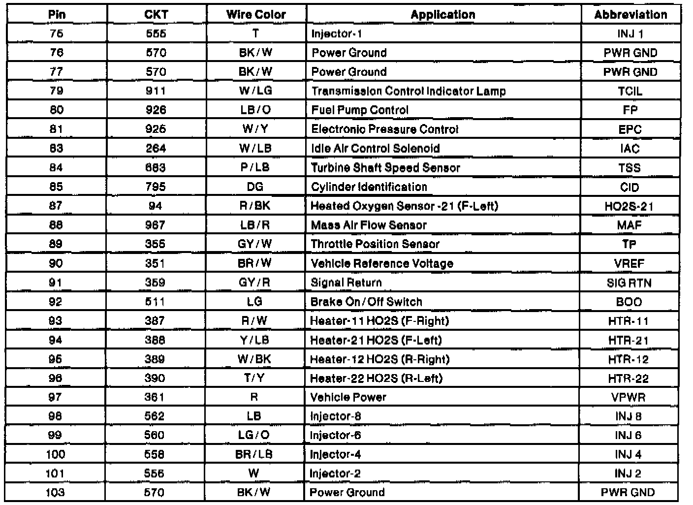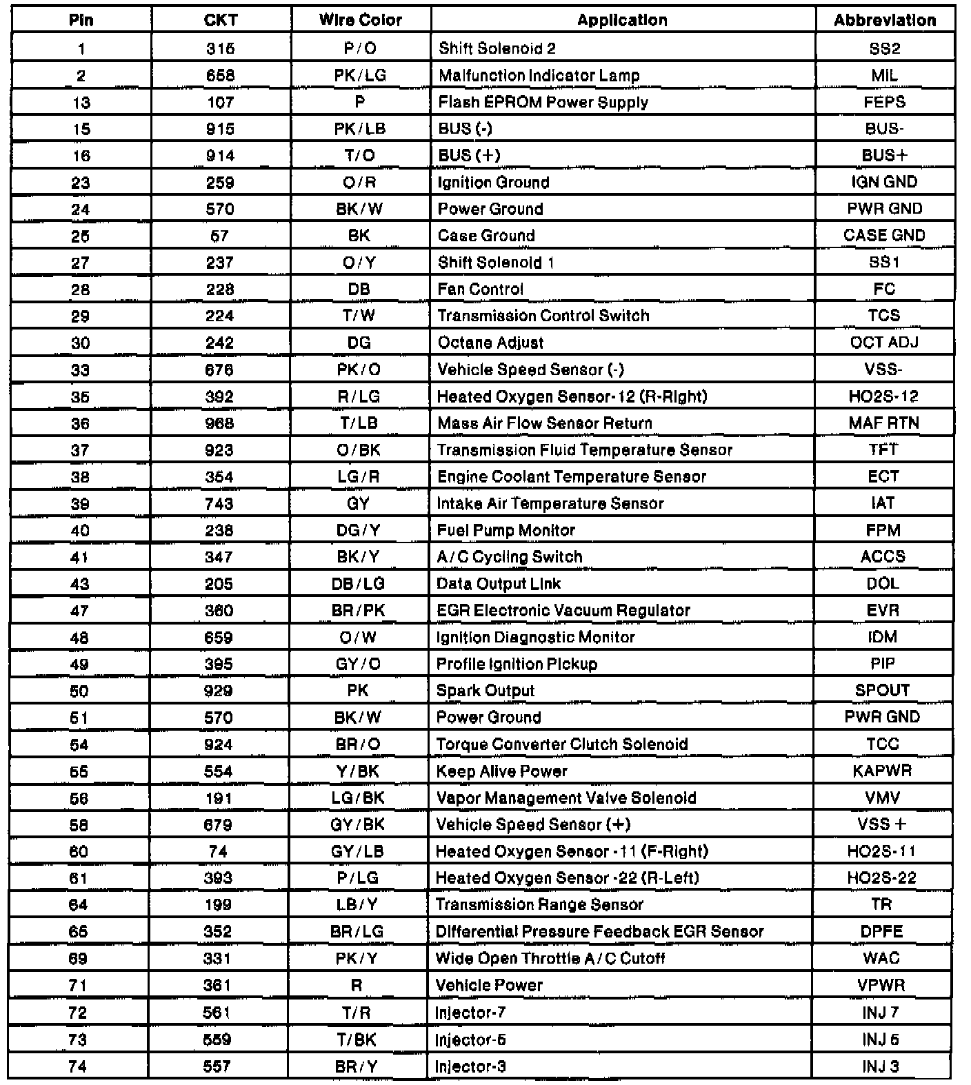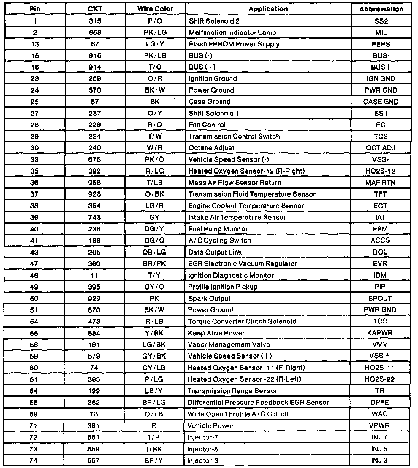 Powertrain Control Module (PCM) Connector Pin Usage (Part 2 Of 2):